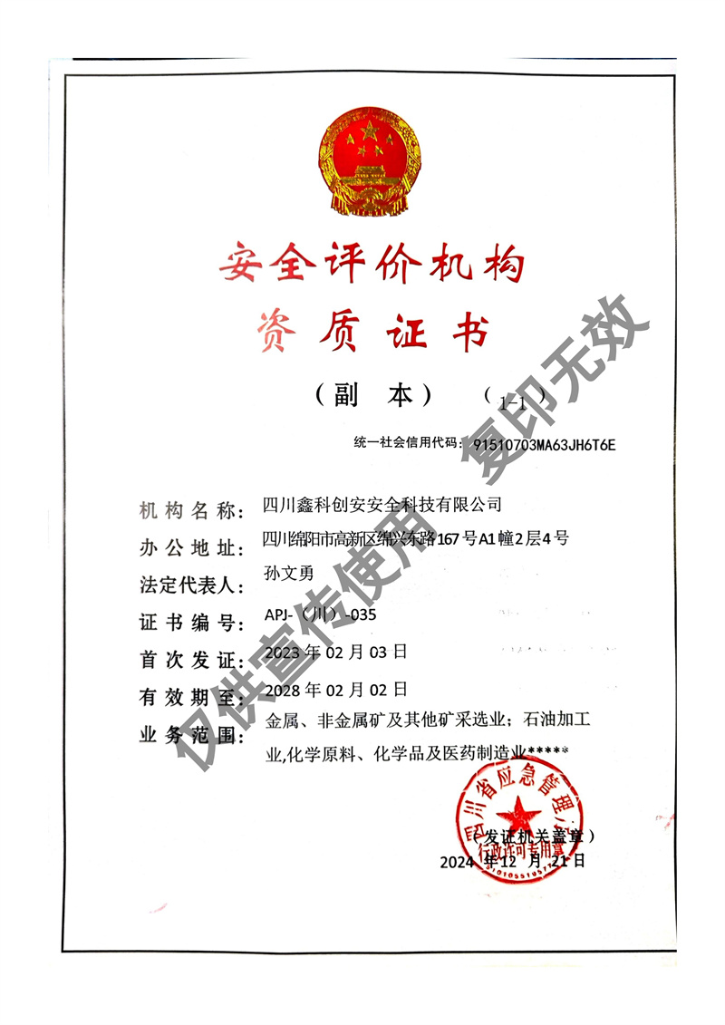 四川鑫科創安安全科技有限公司成立于2020年,是川北地區取得資質的民營安全評價機構(資質證書編號:APJ-(川)-035)。并于2022年牽頭成立綜合應急救援隊伍 - 綿陽曙光應急救援中心。